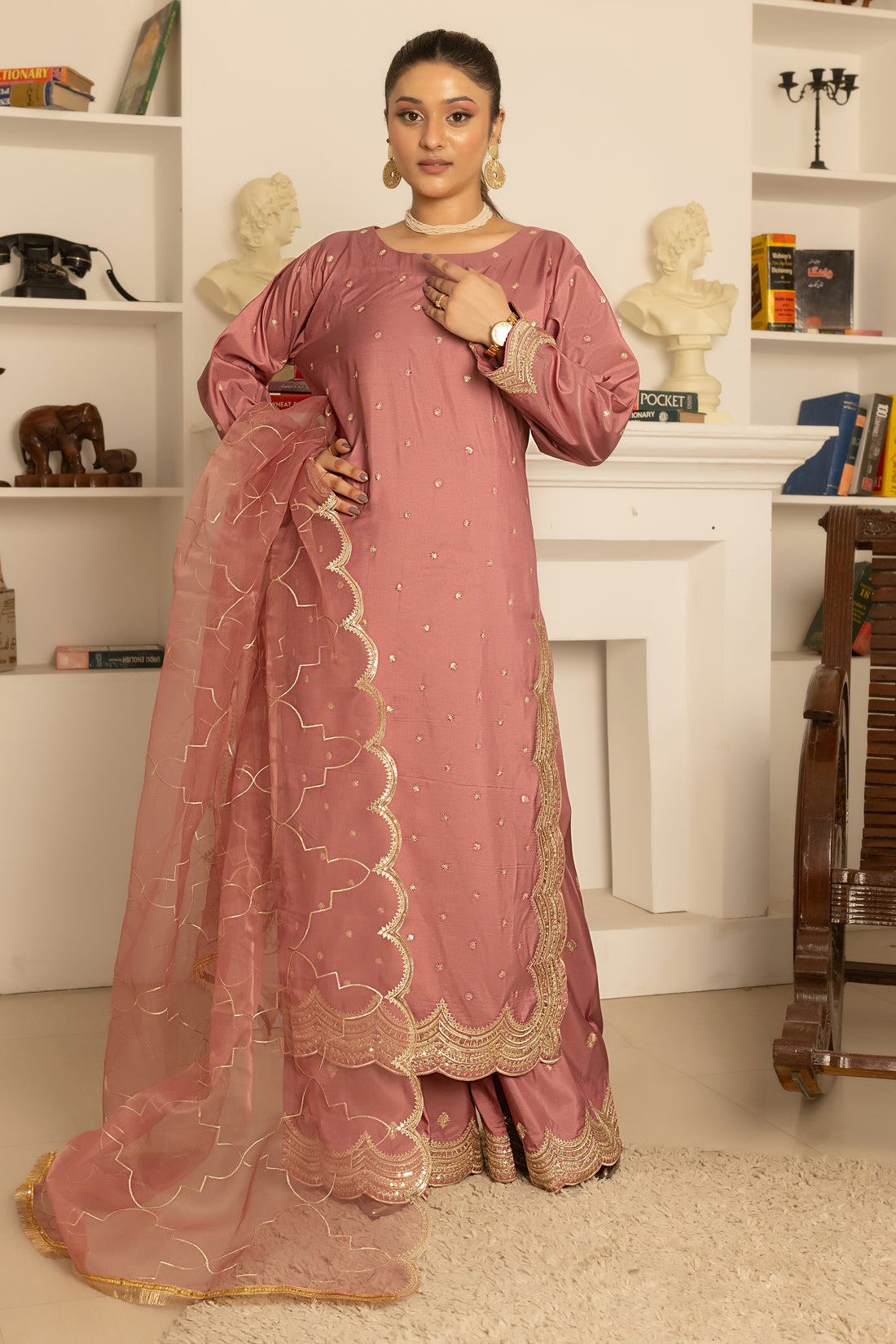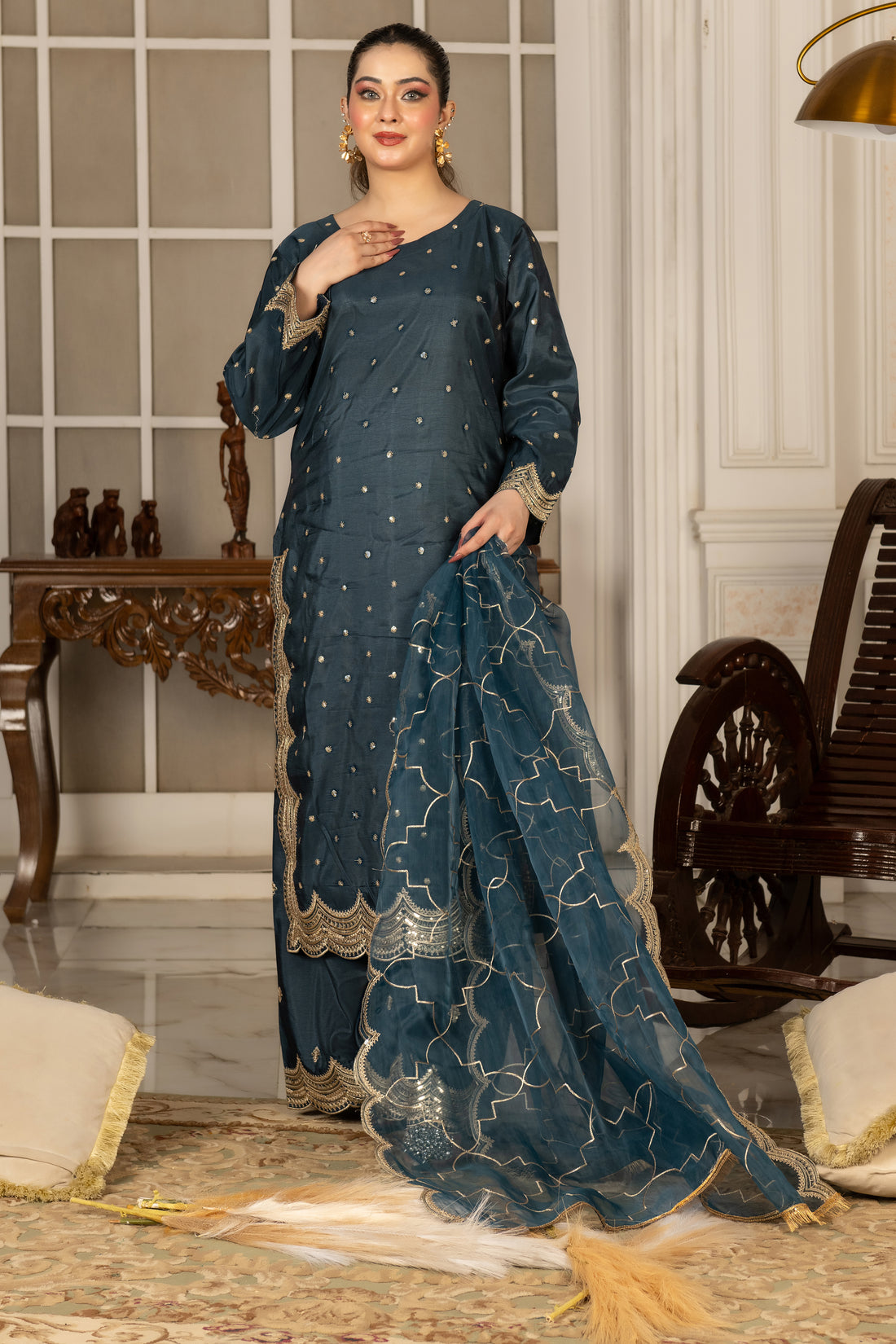 Net Embroidered Hand Made frontNet back With Embroidered borderNet Embroidered sleevesNet Embroidered DupattaRaw Silk Trouser...