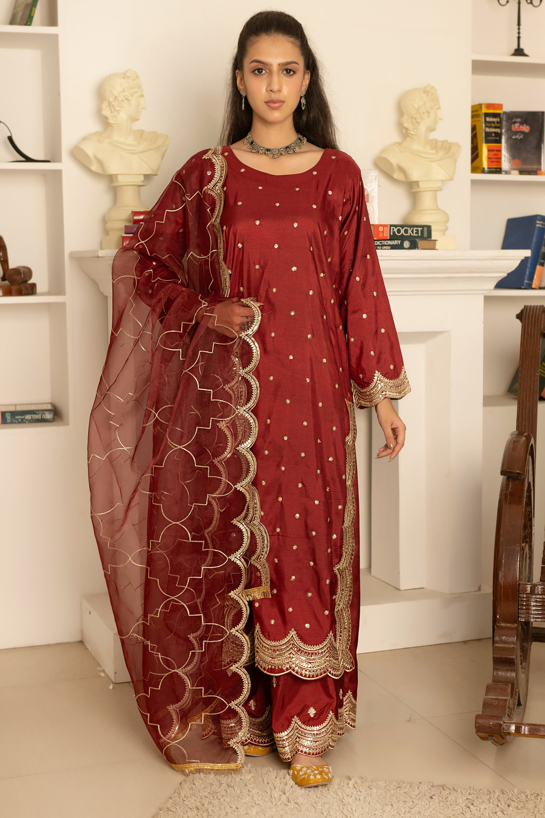 Katan Silk ShirtFront Bottom and Side Tilla EmbroideryGiving Zari LookSleeves Tilla Embroidery