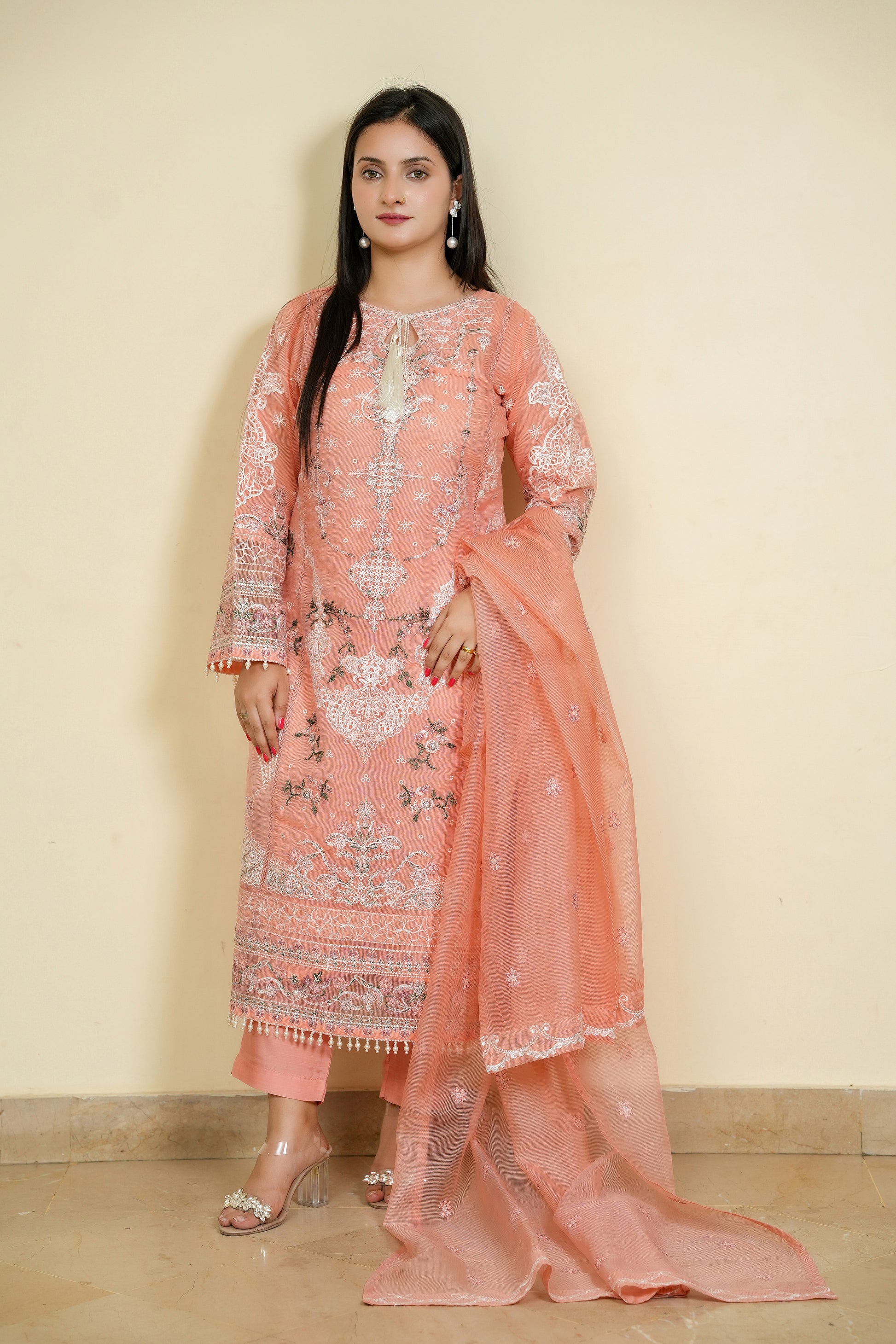 Khaadi net front with 3 panels embroidered in addition with a front tassel and embroidered border with hangings Khaadi net back with embroidered border