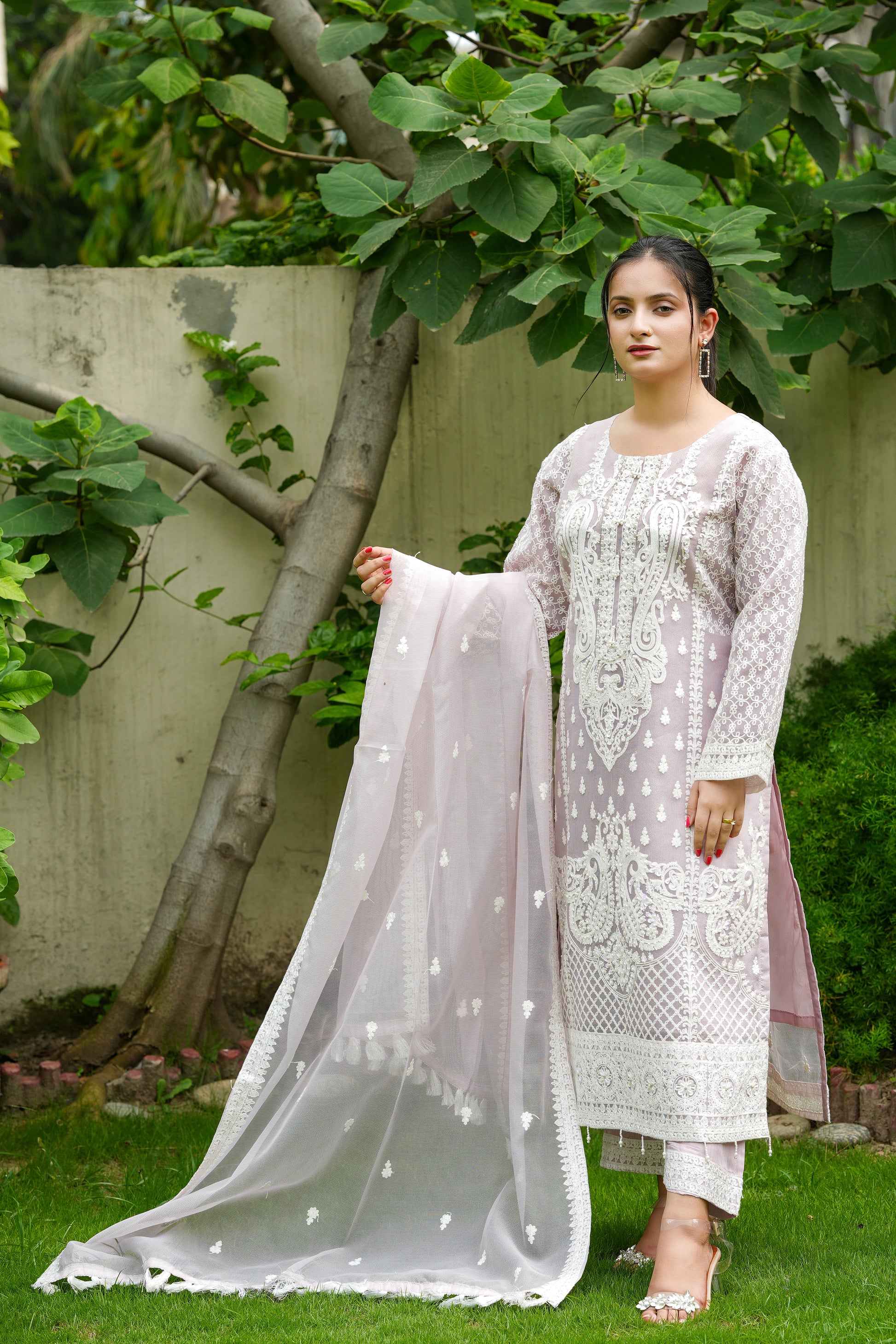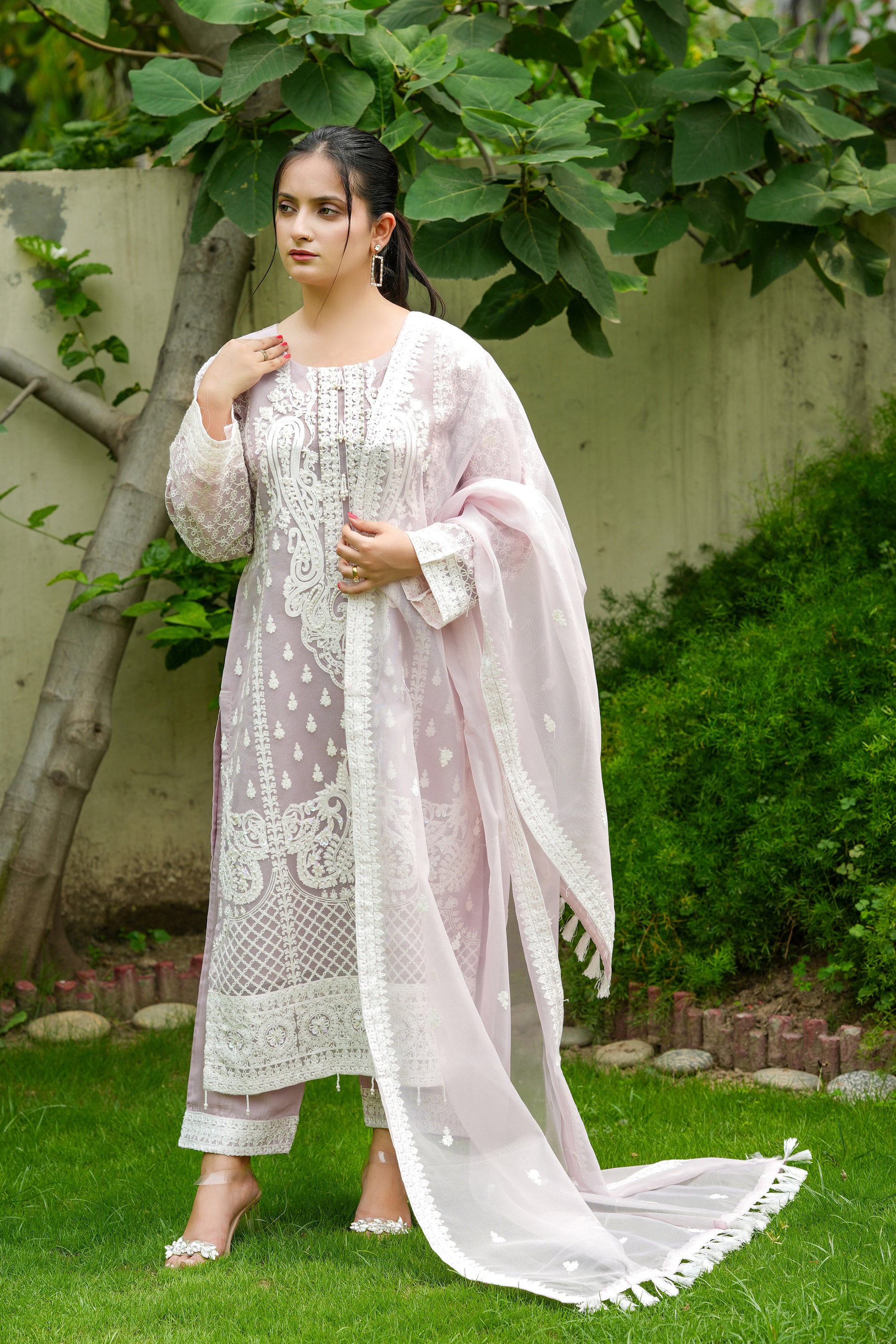 Khaadi net front fully embroidered and embedded with pearls and tassels at neckline and border