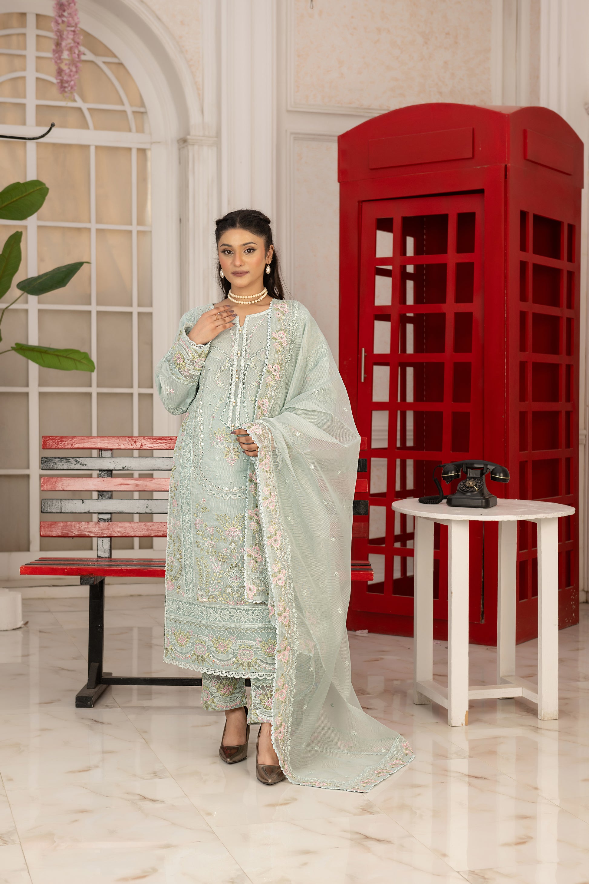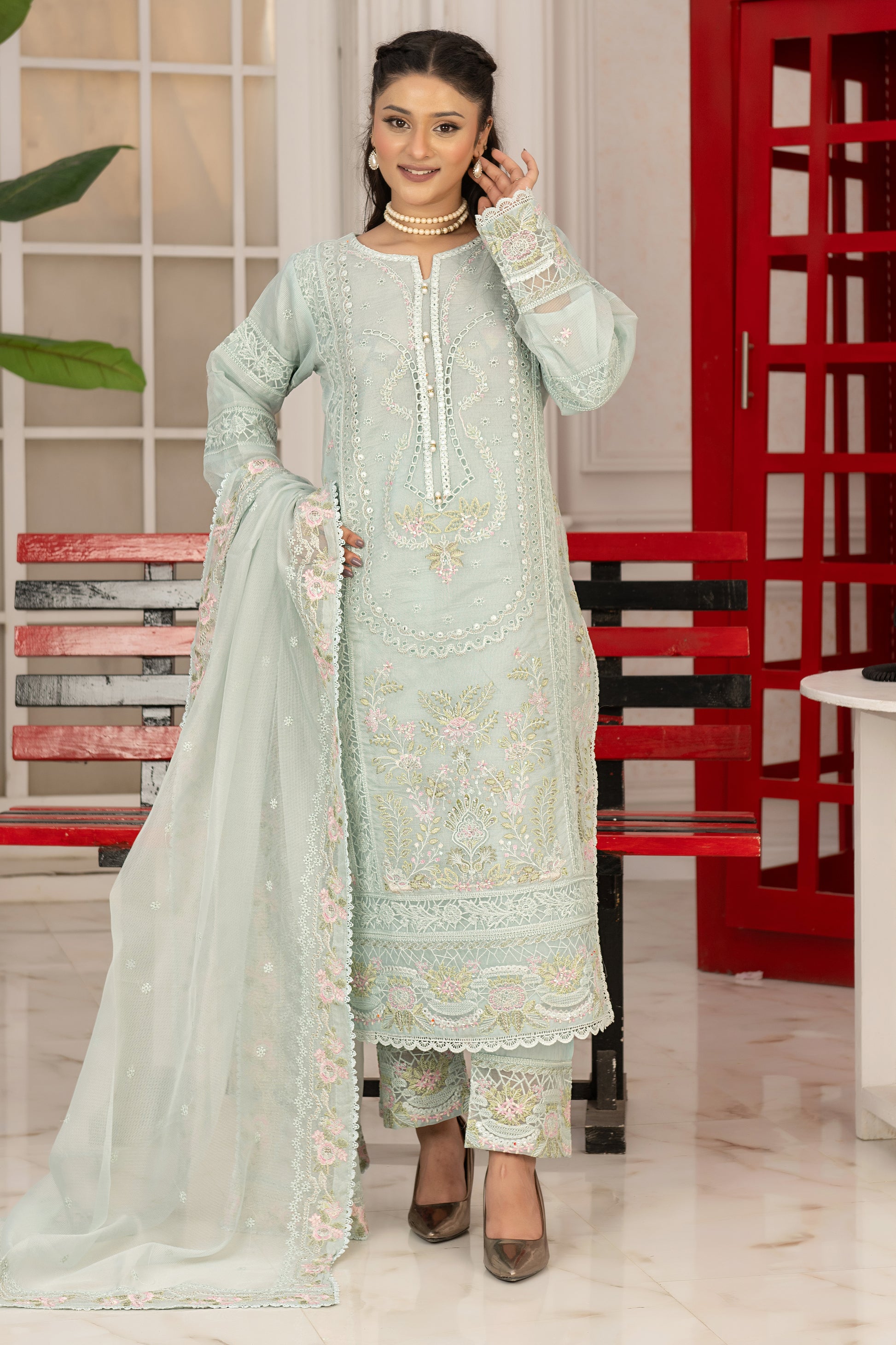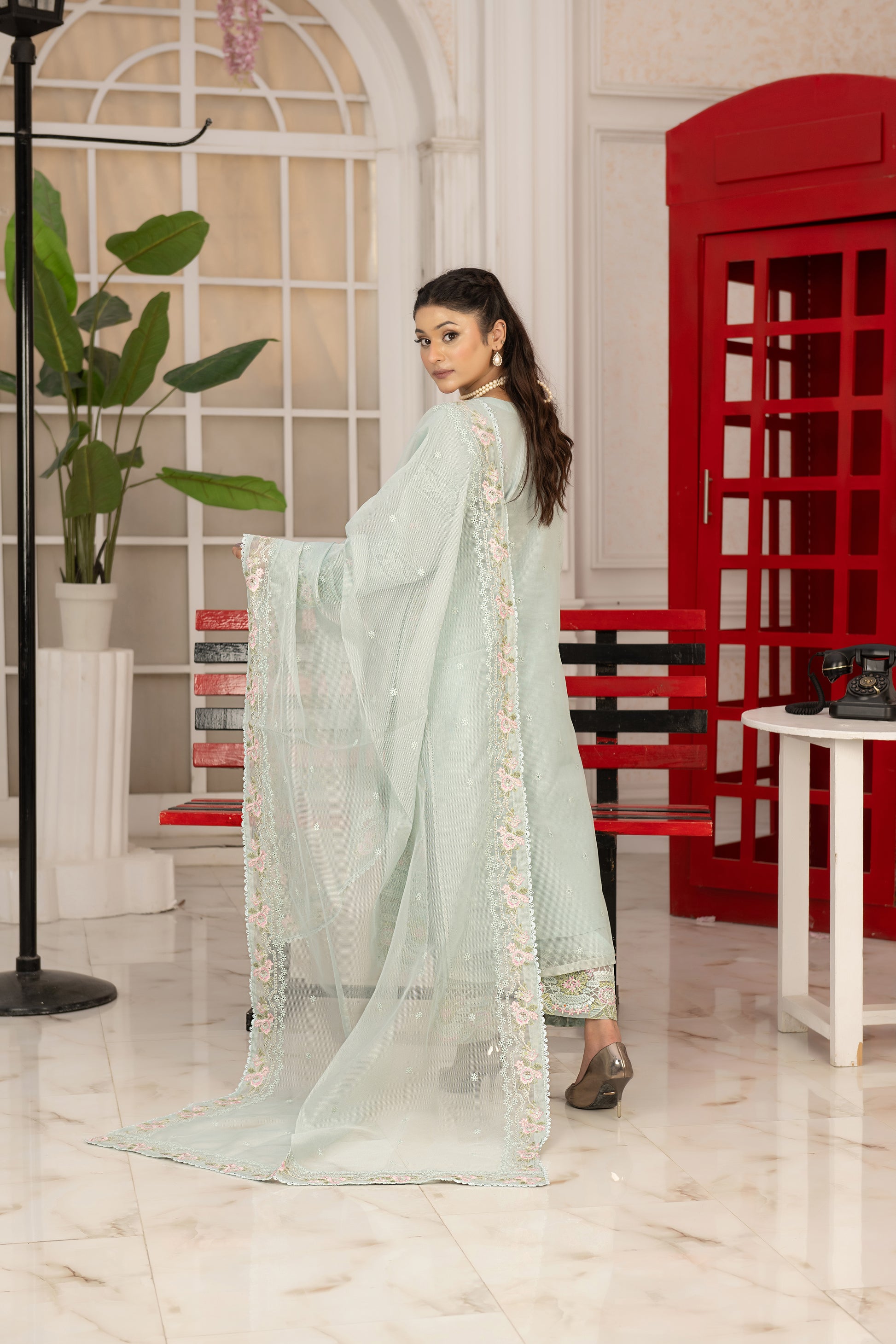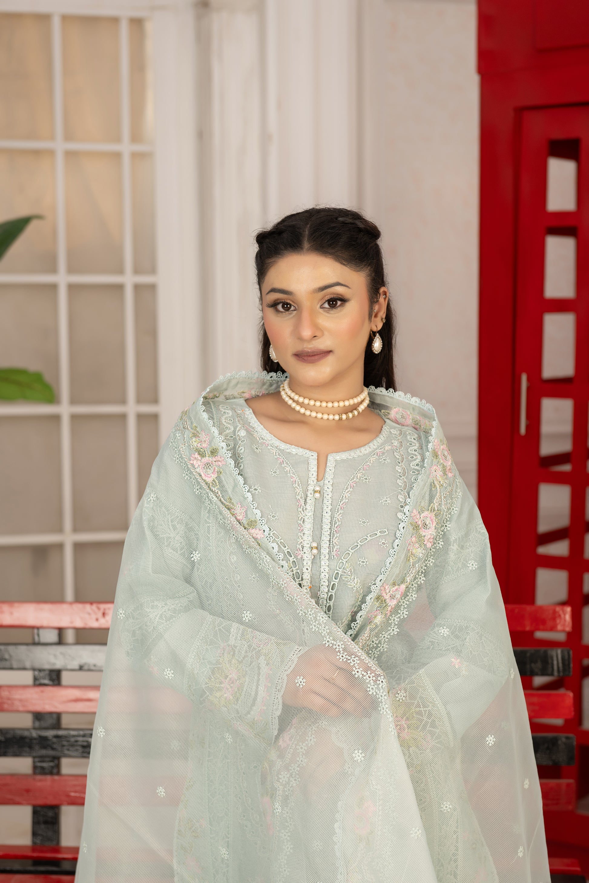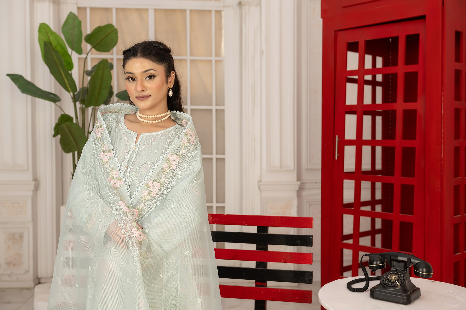 Set against a sophisticated grey base, this ensemble captures the perfect harmony of bold charm and graceful strength. Adorned with intricate threadwork and matte silver sequins, the embroidery adds a subtle yet striking texture-making it a true visual delight. The look is completed with a beautifully embroidered grey dupatta and a natching tonal trouser, offering a cohesive and elegant finish. A statement in refined