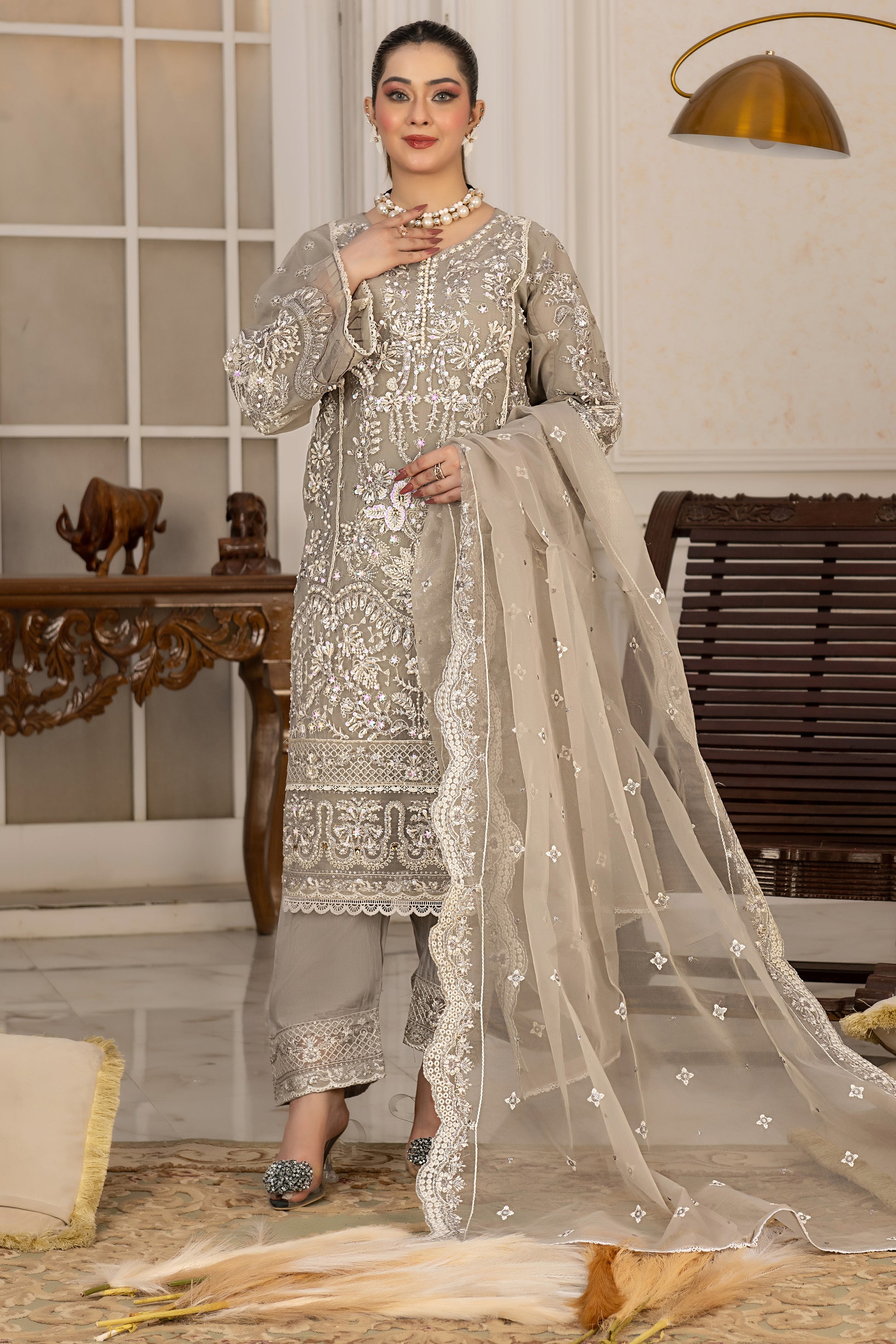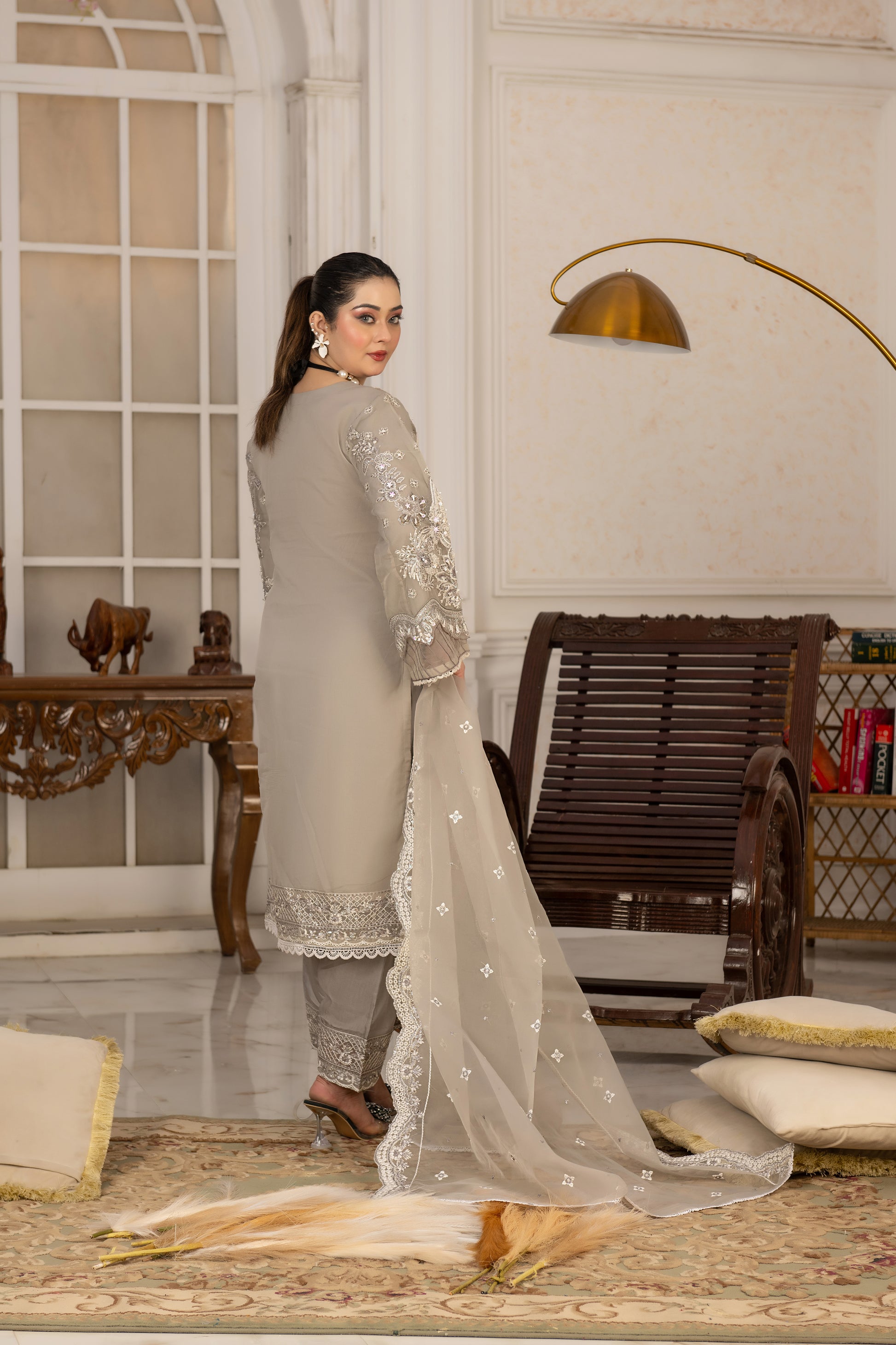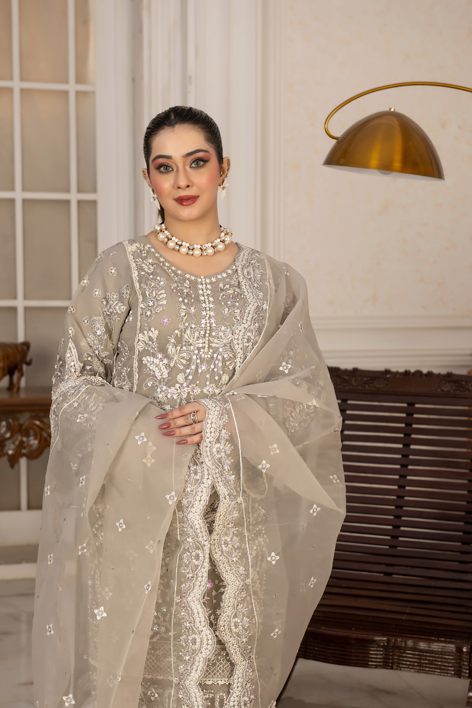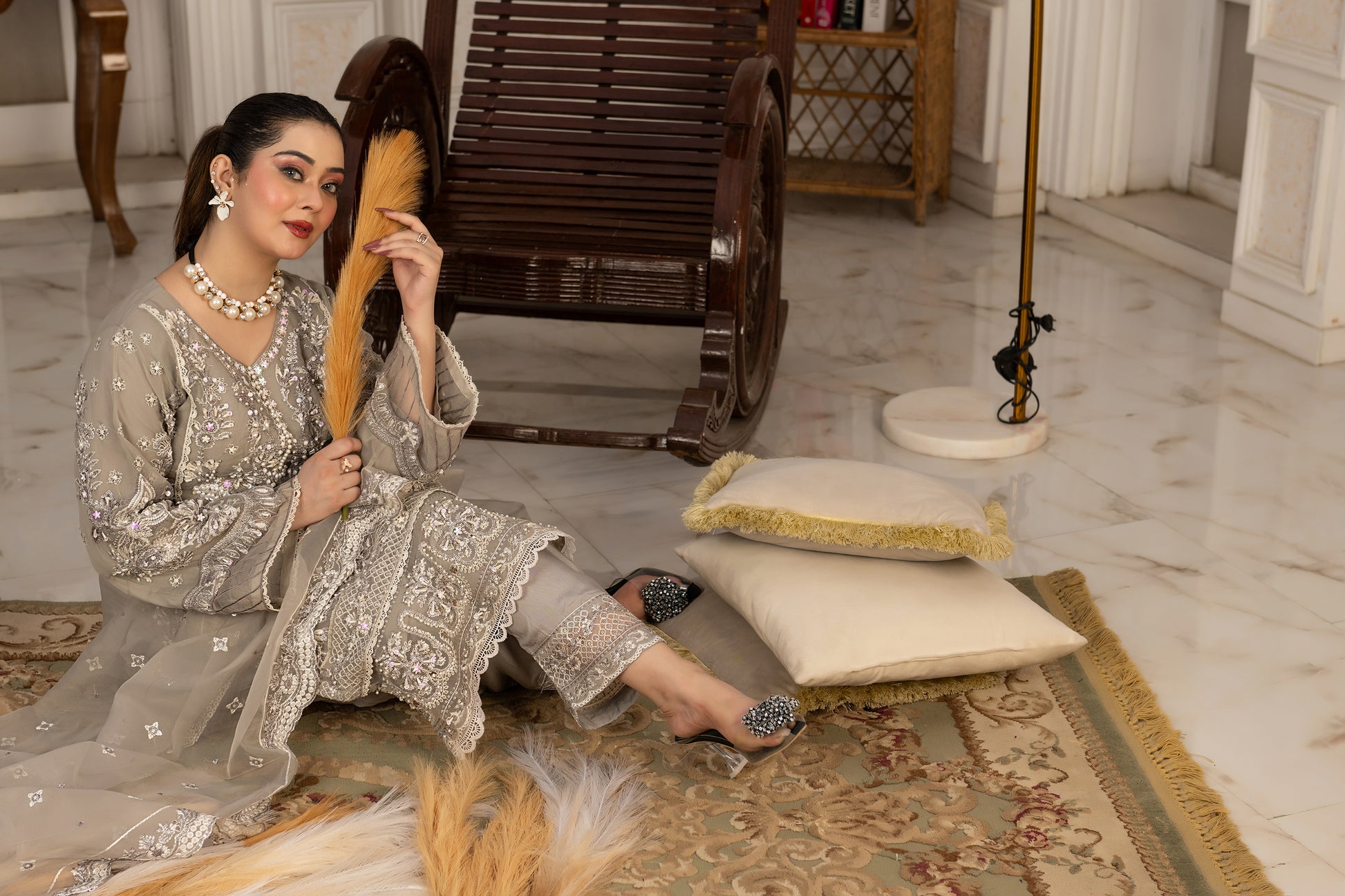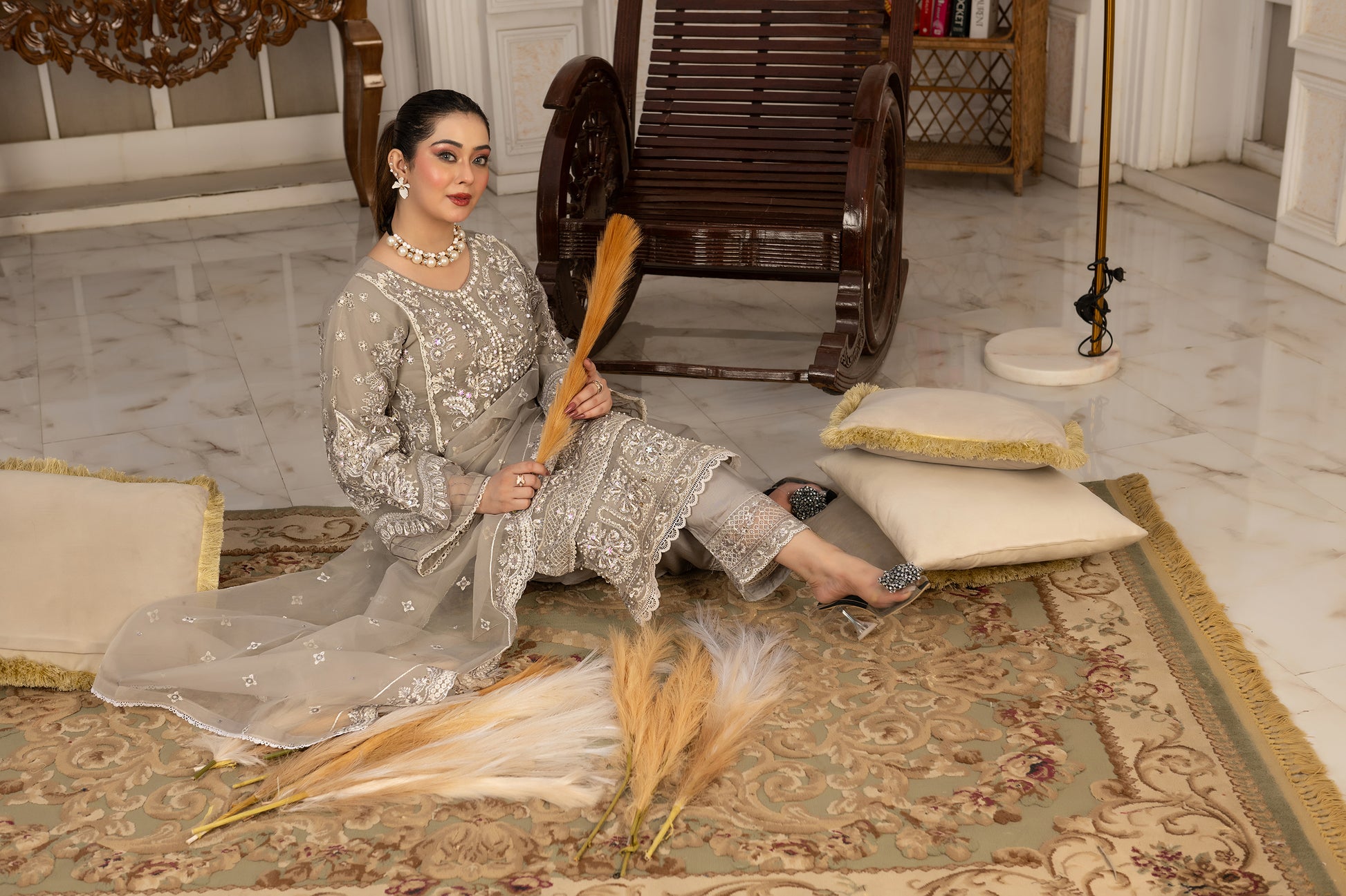 An opulent pastel canvas, this ensemble exudes refined elegance with its shimmering silver sequins and intricate embroidery with embellishment. Delicate floral patterns bloom across the fabric, their beauty heightened by the soft yet striking accents of tilla in the dupatta-adding a touch of artistic vibrance to the ook. Paired with a tonal trouser, the outfit strikes a perfect balance between subtle sophistication and elevated charm, making