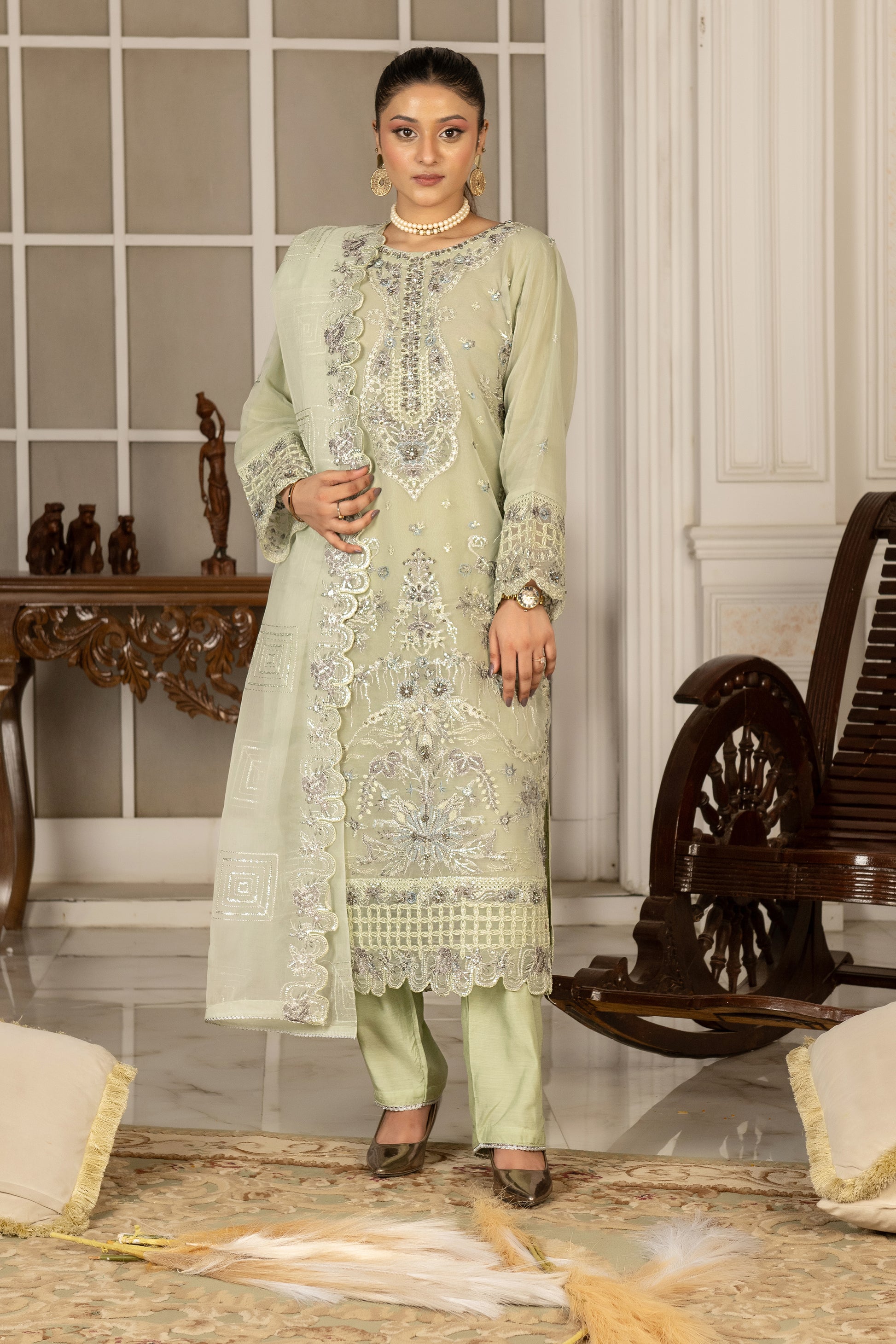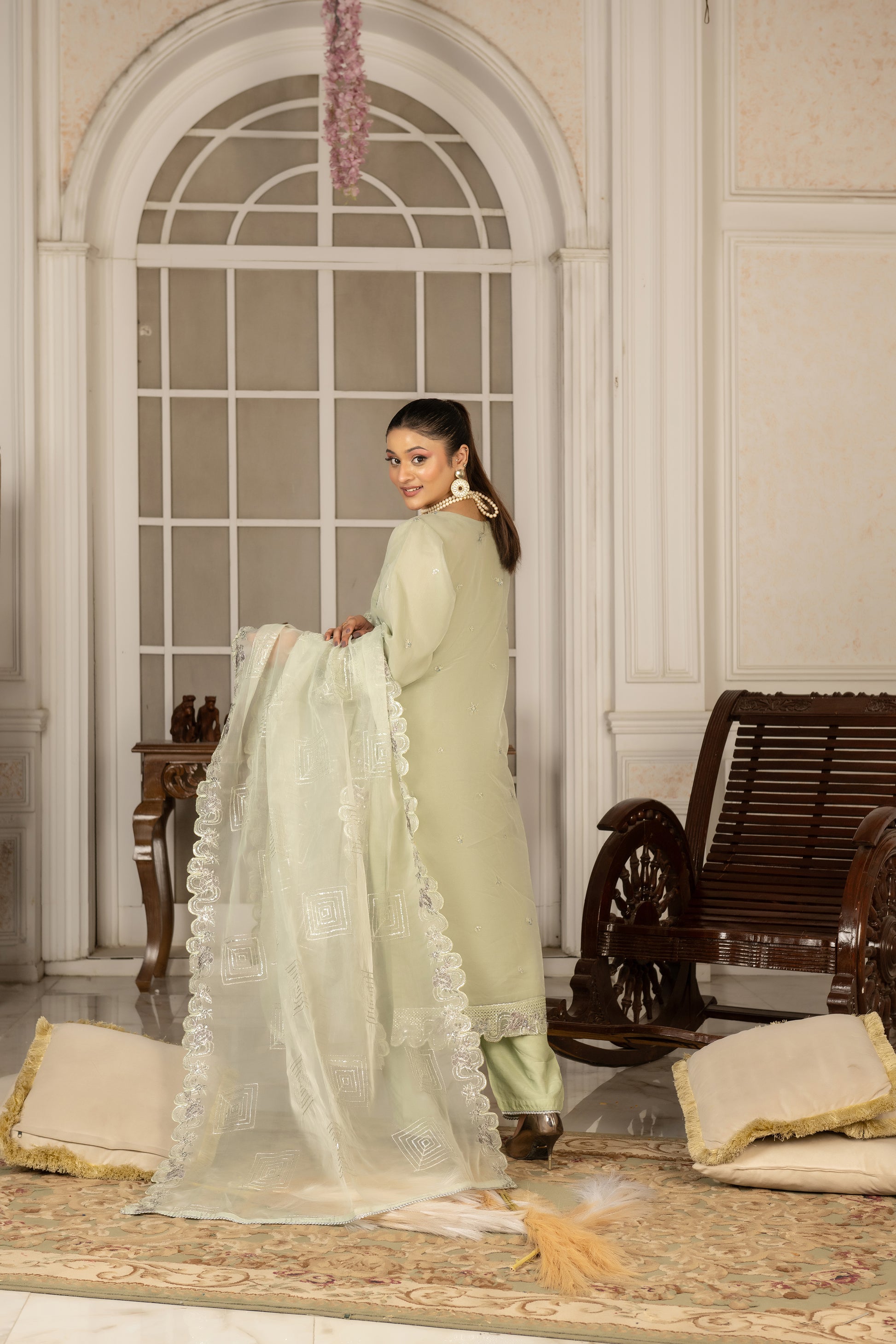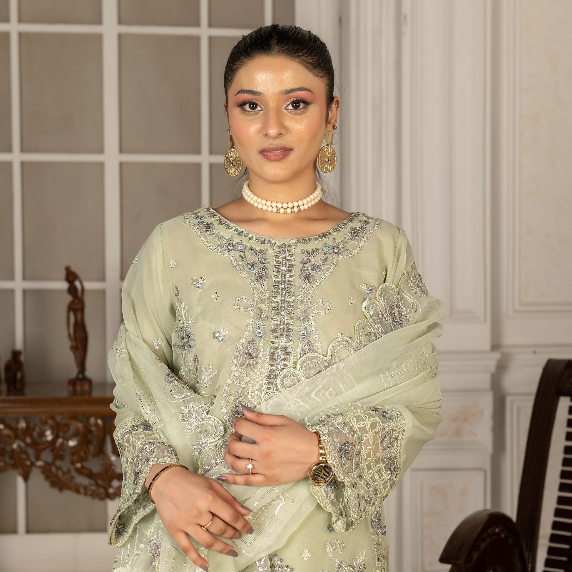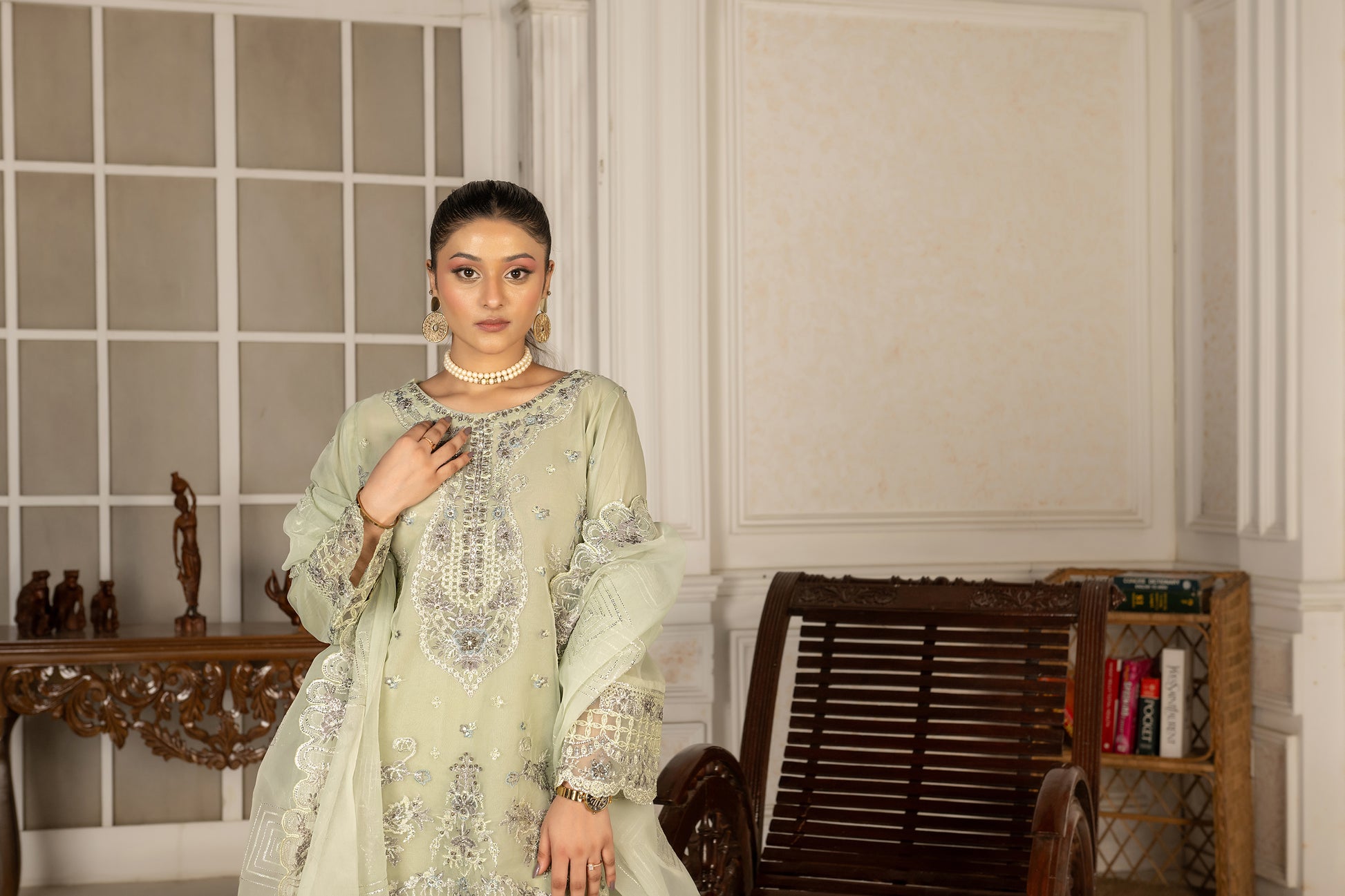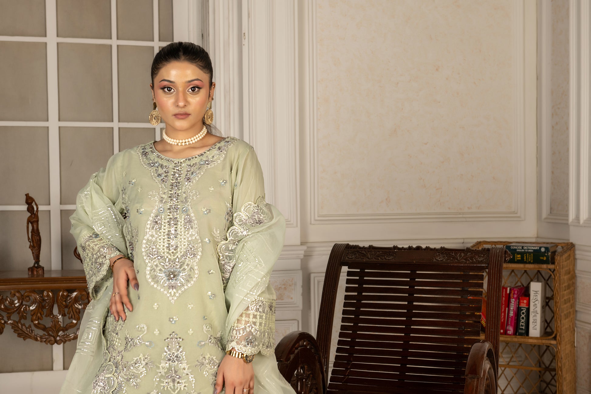 A calm and graceful tribute to pastels, this pastel peach outfit brings a fresh and elegant feel. The shirt features beautiful embroidery, with nude peach thread and tilla gently woven through shiny light gold zari and tiny sequins. The result is a soft, delicate texture that feels both dreamy and classy. The design speaks gently, yet leaves a strong impression. Paired with a lightly embroidered dupatta, the outfit finds the perfect balance-letting the detailed shirt stand out while keeping the overall look light and graceful. A timeless choice for those who appreciate quiet, subtle beauty.